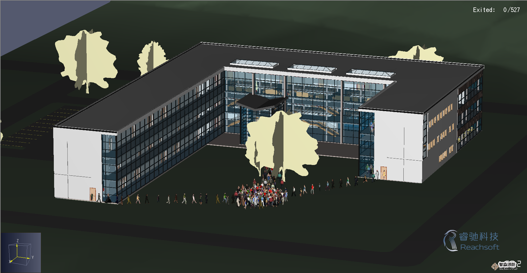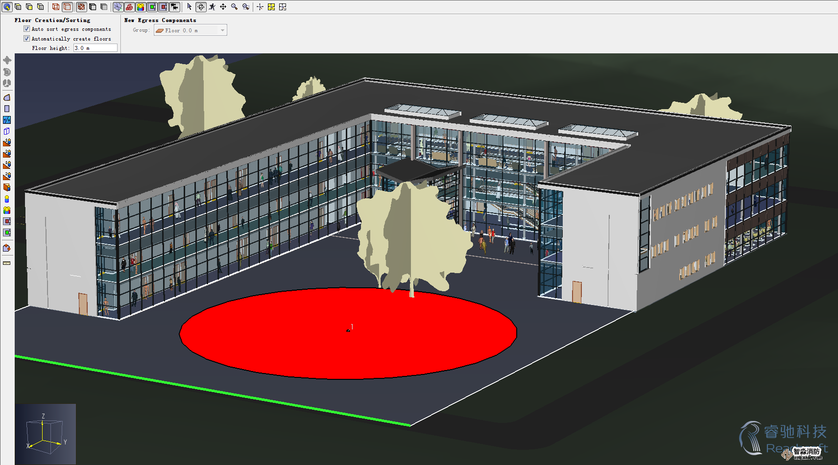 -Pathfinder還專門提供了高性能可視化的3D時間歷程模擬,利用透明化功能來更好地顯示密集人群在樓層中的疏散情況。
